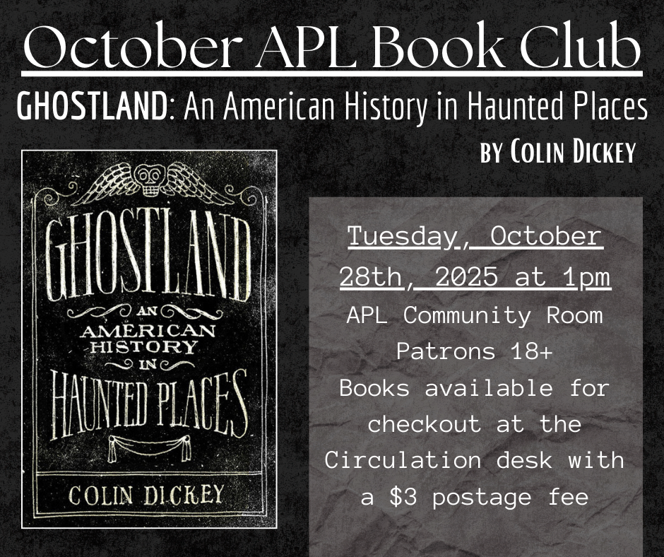 The next Book Club meeting is Tuesday, October 28th at 1:00pm. We will be discussing Ghostland: An American History in Haunted Places by Colin Dickey.
