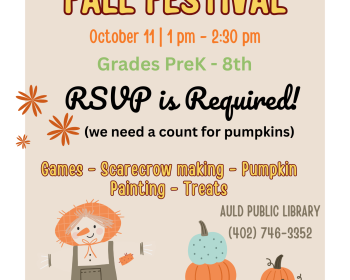 The Library has several events planned for NovemberNovember 8: Fall Fun at the Library PK-K: 9:15 -10:001st -2nd Grades: 10:15- 11:00November 9: Humanities Speaker: Dirk Chatelain24th & Glory: The Intersection of Civil Rights and Omaha’s Greatest Generation of Athletes2:00 p.m. Lower Level of Auld Public LibraryNovember 20: “Christmas in November”…