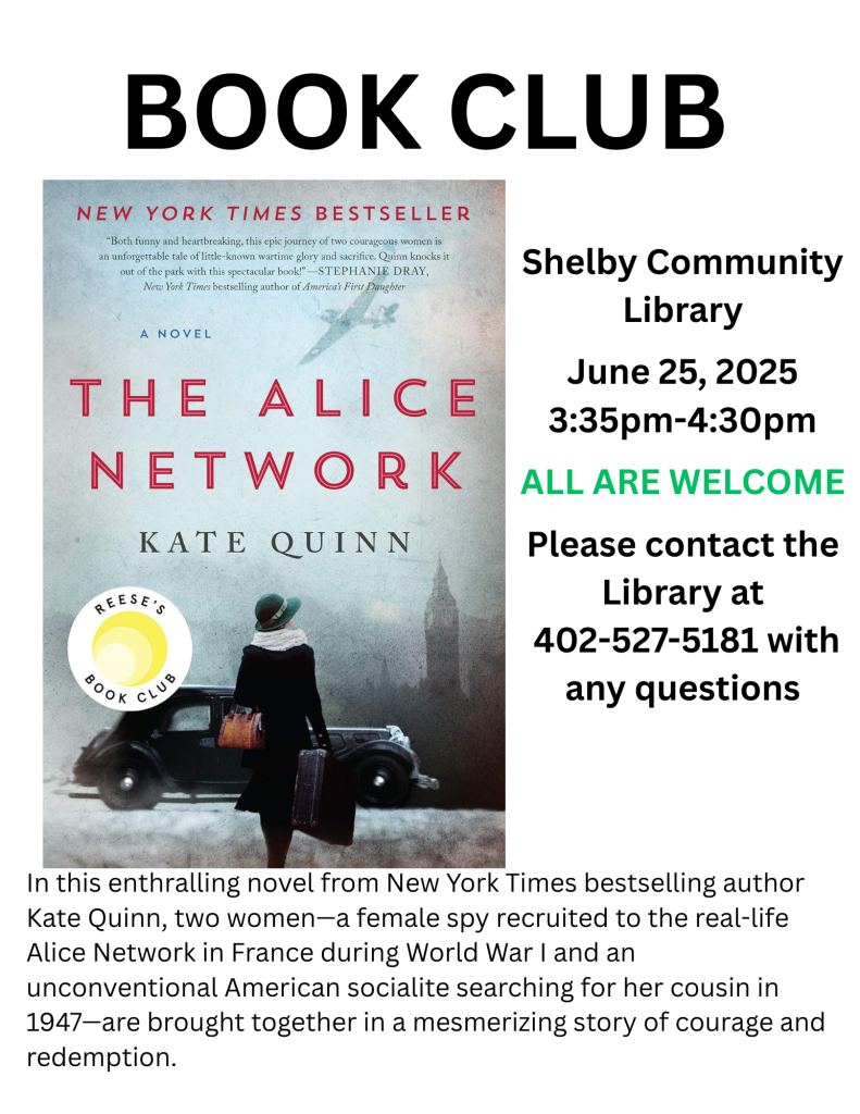 Book Club meets the 4th Wednesday of each month at 3:45 pm at the Shelby Community Library. Feel free to join us any month. It is a informal discussion about the book of the month. The group in moderated by Brenda Alt. If you have any questions, please feel free to call the library at 402-527-5181.