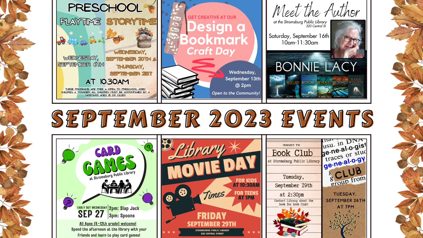 October 2023 EventsPreschool Playtime: Wednesday, October 4th at 10:30am* Pumpkin Painting Party!: Wednesday, October 11th at 2pm **(Pumpkins donated Economy Hometown Market & Becky Nielsen) Book Club: Tuesday, October 17 at 2:30pm Classic Movie Night: Tuesday, October 17th at 6pm Refreshments provided.(This event is free…
