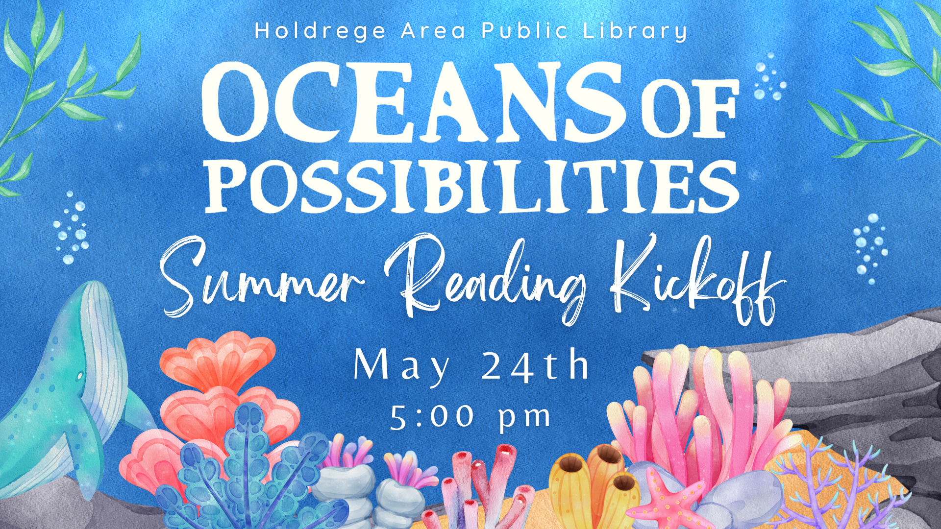 Stop by the library on the main floor of the library from 5:00 – 7:30 pm to sign up for our Summer Reading Program ~ Oceans of Possibilities ~ for ALL AGES & take part in the activities we will have that night as well. Reading challenges, crafts, educational programs, prizes and more are planned for this summer.