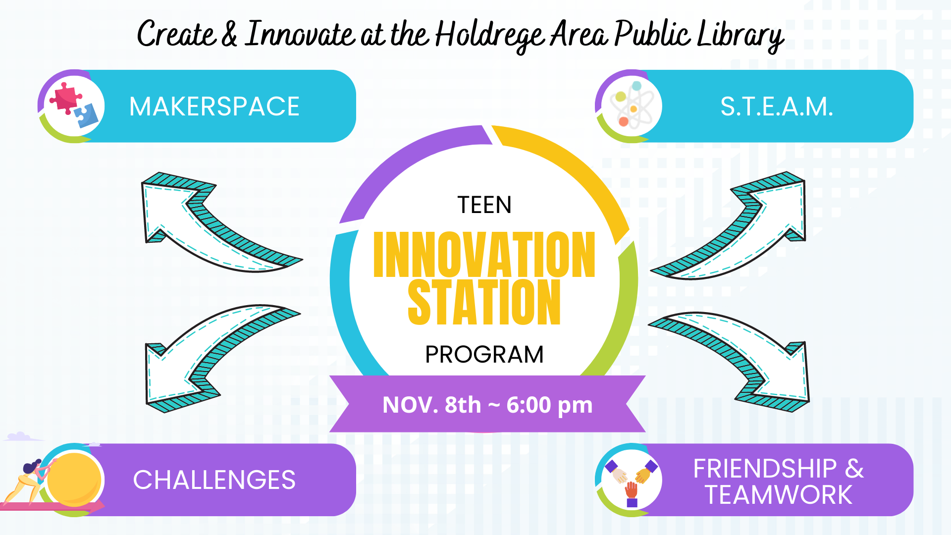 Teen Innovation Station programs will include a mix of using our makerspace equipment, S.T.E.A.M. activities, innovative challenges and more while learning teamwork and friendship skills along the way. Registration is not required and all library programs are free of charge!
