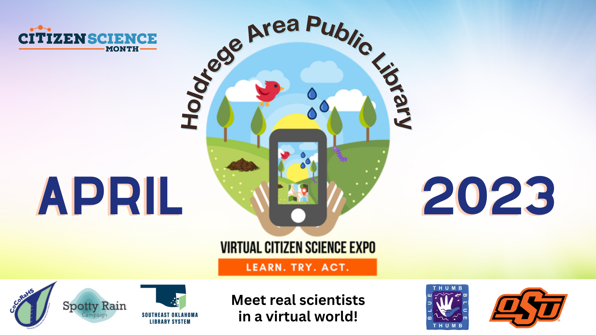 To celebrate, we have partnered with Oklahoma State University, the Spotty Rain Campaign, Blue Thumb, CoCoRaHS, and the South East Oklahoma Library System to bring you a Virtual Citizen Science Expo from April 3rd through April 27th at the Holdrege Area Public Library or you can stop by during these dates to find out how to access the Expo from your own home!