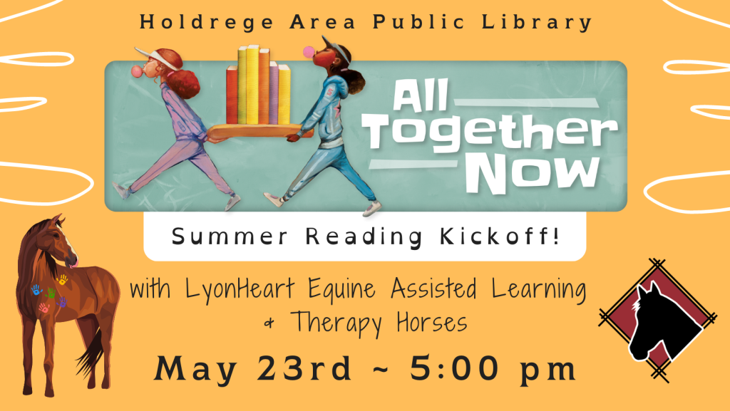 Stop by the library on the main floor, to sign up for our Summer Reading Program ~ All Together Now ~ for ALL AGES. Then step outside and take part in the activities with LyonHeart Equine Assisted Learning and their therapy horses! LyonHeart will have several educational and fun activity stations ready. **Waivers will need to be signed before interacting with the horses**. Reading challenges, crafts, educational programs, prizes, and more are planned for this summer. The library will be open from 12:00 pm – 8:00 pm on our Kickoff Night to accommodate for our event! You won’t want to miss out!