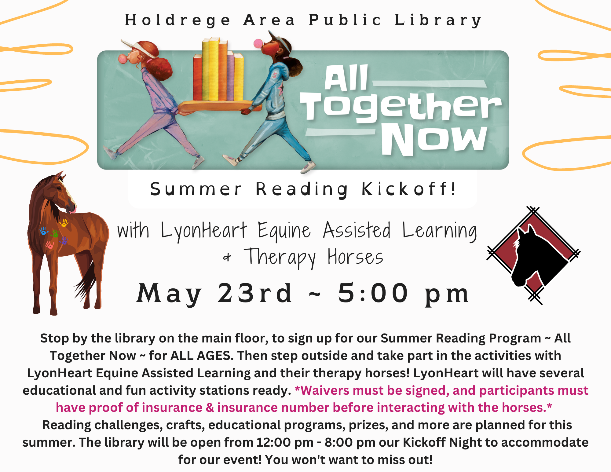 Join us this summer for our ~ All Together Now ~ summer reading program. We have reading challenges, crafts, educational programs, prizes and more are planned for this summer for all age groups, even adults!