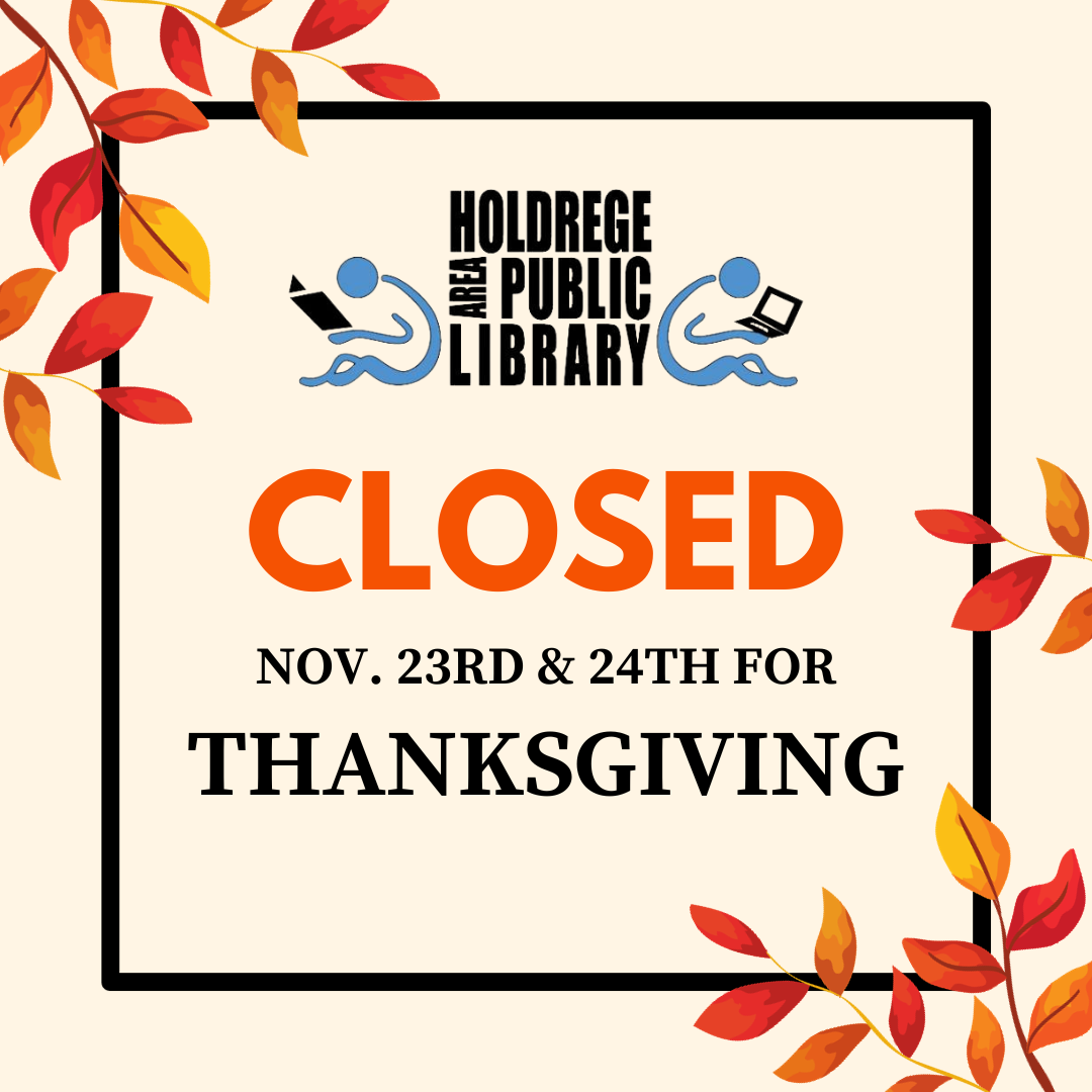 The Holdrege Area Public Library will be closed on Nov. 23rd & Nov. 24th, we will be open Saturday! We hope you have a wonderful holiday, there is so much to be thankful for! ![]()