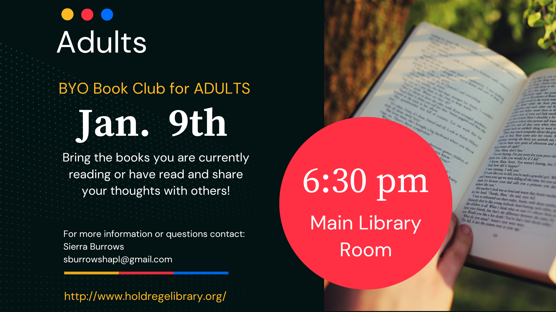 Are you an avid reader with a passion for books? Join our BYO (Bring Your Own) Book Club for Adults in the Main Library Room. Bring your favorite 2-3 books that you’re currently reading or have read in the past, and get ready for a unique book club experience. Whether you’re into thrilling mysteries, heartwarming romances, mind-bending sci-fi, or captivating non-fiction, our BYO Book Club is the perfect place to share your literary adventures with fellow book enthusiasts.