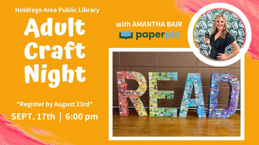 Join us for a fun and creative evening at the library! Our special guest, Amantha Bair from PaperPie, will guide us in making beautiful decoupage letters that spell out “READ” using tiny pictures of book covers. This event is perfect for all skill levels, whether you’re an experienced crafter or just looking to try something new. All materials will be provided, and you’ll leave with a unique and personalized piece of art to display at home or in your favorite reading nook.