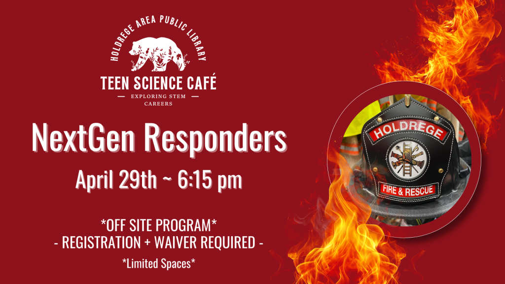 Join us for a special offsite Teen Science Café event, NextGen Responders! We will be walking over to the Holdrege Volunteer Fire & Rescue station to meet with Ashley Brock and Gregg Erickson for a behind-the-scenes tour and interactive activity that explores the science and strategy behind emergency response.