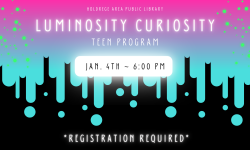 *Registration Required* Teens 5th-12th grade are invited to join in the fun for Luminosity Curiosity to kick off a new year of programming! This will be an electrifying teen program designed to ignite curiosity and creativity! Get ready to immerse yourself in a world of glowing wonder where imagination knowsโฆ
